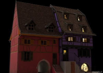 On the same principle, houses from the film were roughly modelled, details come from displacement maps created in Substance Designer, no time to waste in a topology and unwrapping puzzle on each model.
