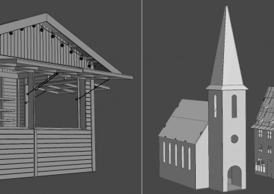 This year, I welcomed RailClone! Once assets have been created (low poly Alsatian houses), all I needed to create was a single array driven by a spline to draw streets full of houses aligned to the spline segments. To test the process, I downloaded a map of historical centre of Eguisheim and drew splines on top to generate a village. The result was conclusive enough to be used in the film.